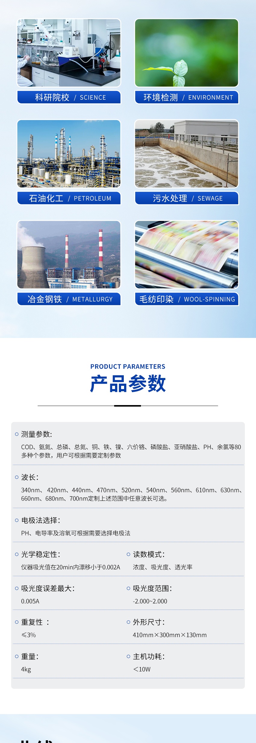 1、測量參數:COD、氨氮、總磷、總氮、銅、鐵、鎳、六價鉻、磷酸鹽、亞硝酸鹽、PH、余氯等80多種個參數,用戶可根據需要定制參數