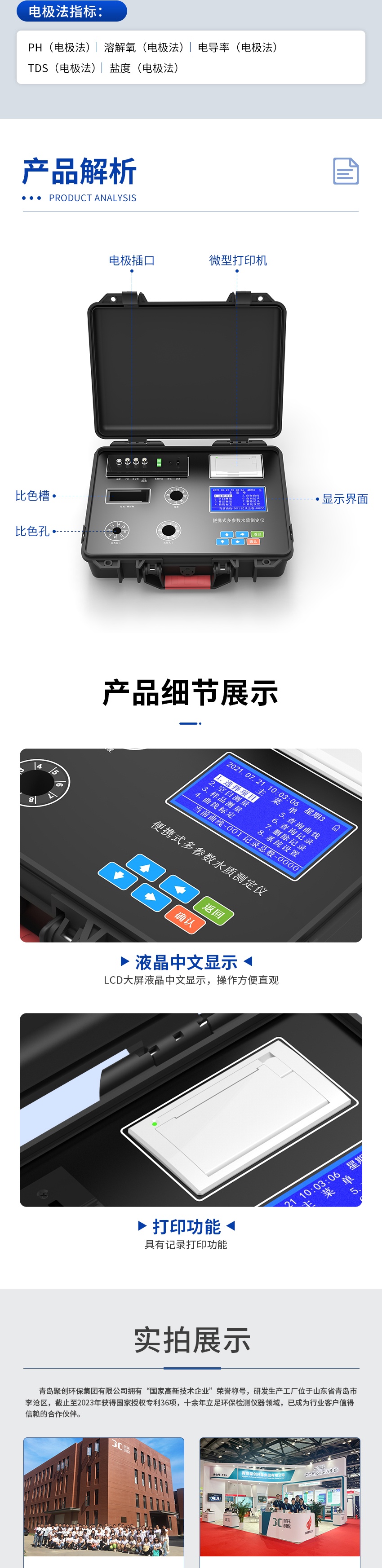 JC-Bplus便攜式多參數水質測定儀含有光學法及電極法(PH、電導及溶氧)用戶可以根據需要進行自由的組合。廣泛適用于飲用水、地表水、地面水及污水的測定。