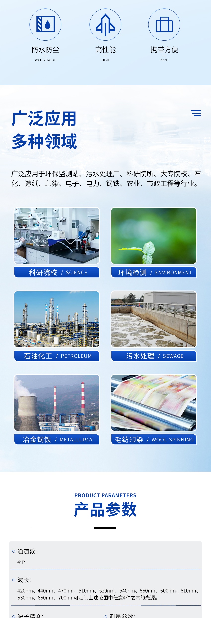 序號 測定項目 測定范圍 單位 誤差 1 COD(錳法) 0.00-10.00 mg/L 0.2或5% 2 氨氮 0.00-25.00 mg/L 0.2或5% 3 余氯(低量程) 0.02-2.00 mg/L 0.1或5% 4 余氯(高量程) 2.00-10.00 mg/L 5% 5 總氯(低量程) 0.02-2.00 mg/L 0.1或5% 6 總氯(高量程) 2.00-10.00 mg/L 5% 7 二氧化氯(低量程) 0.05-2.00 mg/L 0.2或5% 8 二氧化氯(高量程) 2.00-20.00 mg/L 5% 9 硫酸鹽 5-200 mg/L 5% 10 硝酸鹽氮 0.02-10.0 mg/L 0.1或5% 11 磷酸鹽(低量程) 0.01-10.0 mg/L 0.2或5% 12 磷酸鹽(高量程) 10.0-50.0 mg/L 5% 13 亞硝酸鹽氮(低) 0.02-1.0 mg/L 0.05或5% 14 亞硝酸鹽氮(高) 1.0-5.0 mg/L 5% 15 硫化物 0.005-1.000 mg/L 5%(F.S) 16 氟化物 0.05-2.0 mg/L 5%(F.S) 17 氰化物 0.01-0.50 mg/L 5%(F.S) 18 溴化物 0.10-5.00 mg/L 5%(F.S) 19 甲醛 0.05-2.5 mg/L 5%(F.S) 20 揮發酚(低) 0.20-5.0 mg/L 5%(F.S) 21 揮發酚(高) 5.0-10.0 mg/L 5%(F.S) 22 聯氨 0.01-0.50 mg/L 5%(F.S) 23 苯胺類化合物(低) 0.03-1.0 mg/L 5%(F.S) 24 苯胺類化合物(高) 1.0-5.0 mg/L 5%(F.S) 25 二氧化硅 0.01-5.00 mg/L 5%(F.S) 26 總堿度(低) 0-100 mg/L 5%(F.S) 27 總堿度(高) 100-1000 mg/L 5%(F.S) 28 總硬度(低) 0.1-5.0 mg/L 5%(F.S) 29 總硬度(中) 5.0-50.0 mg/L 5%(F.S) 總硬度(高) 50.0-500.0 mg/L 5%(F.S) 30 氯離子/氯化物 0.20-100.0 mg/L 5%(F.S) 31 銅(低) 0.02-1.0 mg/L 5%(F.S) 32 銅(高) 1.0-10.0 mg/L 5%(F.S) 33 鋅 0.2-5.0 mg/L 5%(F.S) 34 鎳(低) 0.02-0.50 mg/L 5%(F.S) 35 鎳(高) 0.50-1.00 mg/L 5%(F.S) 36 鎳 0.02-10.0 mg/L 5%(F.S) 37 鐵(低) 0.0-5.0 mg/L 5%(F.S) 38 鐵(高) 5.0-10.0 mg/L 5%(F.S) 39 六價鉻 0.01-1.00 mg/L 5%(F.S) 40 鎘 0.05-0.50 mg/L 5%(F.S) 41 錳(低) 0.01-0.10 mg/L 5%(F.S) 42 錳(高) 0.10-1.0 mg/L 5%(F.S) 43 錳 0.02-5.00 mg/L 5%(F.S) 44 總鉻(需配消解儀) 0.02-1.0 mg/L 5%(F.S) 45 鋁(低) 0.01-0.40 mg/L 5%(F.S) 46 鋁(高) 0.40-4.00 mg/L 5%(F.S) 47 銀 0.01-1.00 mg/L 5%(F.S) 48 鉬 0.05-1.00 mg/L 5%(F.S) 49 砷(低) 0.004-0.100 mg/L 5%(F.S) 50 砷(高) 0.100-0.500 mg/L 5%(F.S) 51 銻 0.5-10.0 mg/L 5%(F.S) 52 硼 0.10-2.00 mg/L 5%(F.S) 53 汞 0.002-0.50 mg/L 5%(F.S) 54 鉛 0.01-0.50 mg/L 5%(F.S) 55 PH 5.00-8.00 PH 0.1±0.1 56 溶解氧 0.1-10.0 mg/L 0.1±5% 57 臭氧 0.01-2.5 mg/L 5%(F.S) 58 陰離子表面活性劑 0.01-1.0 mg/L 5%(F.S) 59 尿素 0.10-4 mg/L 5%(F.S) 60 氰尿酸低 0~100mg/L mg/L 5%(F.S) 61 氰尿酸高 100~200mg/L mg/L 5%(F.S) 62 硅酸鹽 0.01-6.00 mg/L 5%(F.S)