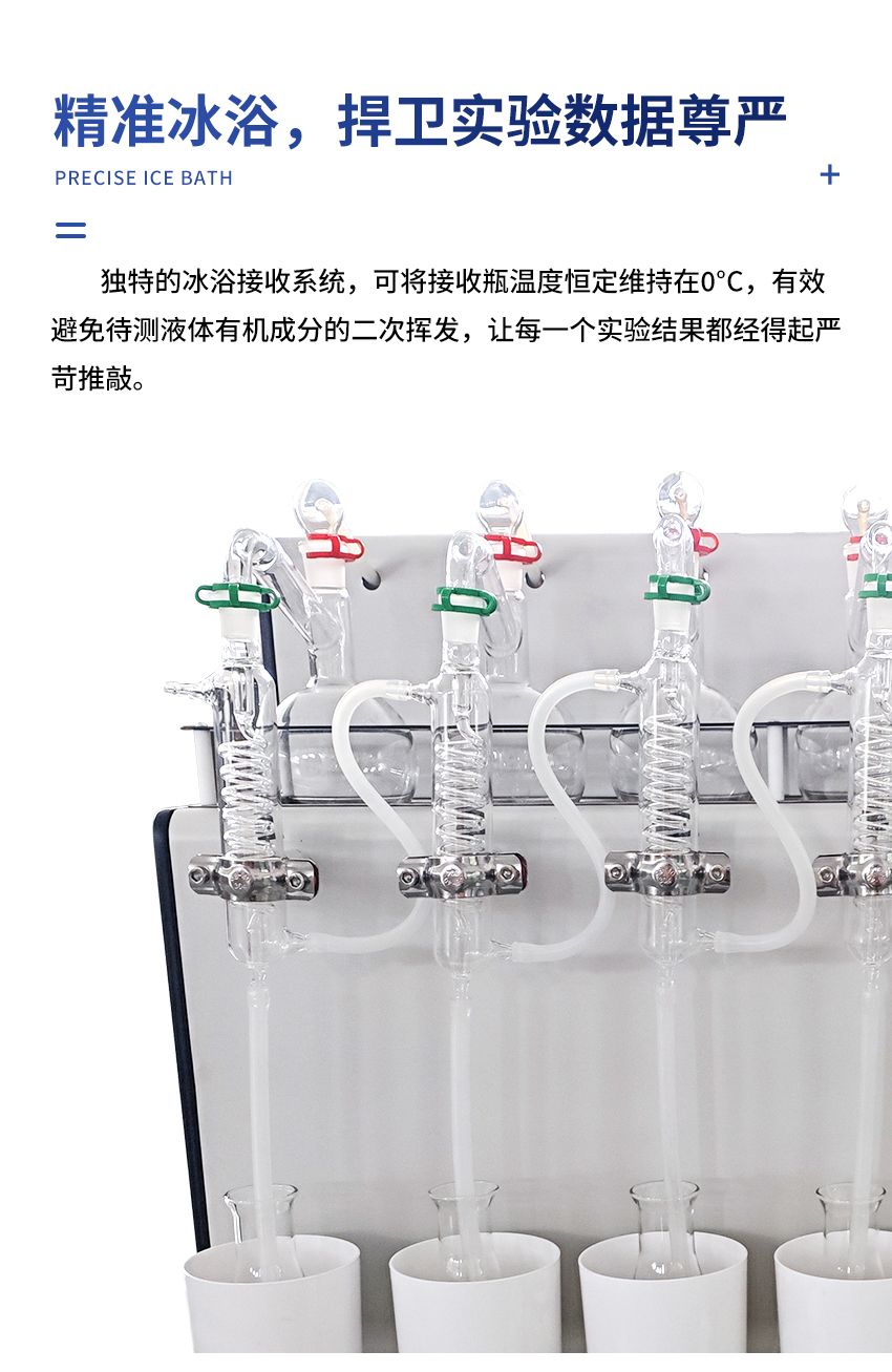 6. 獨特冰浴接收功能:針對特定檢測項目,在餾出液收集區域增設獨立高效制冷裝置,可長期維持收集瓶處于0°C狀態,切實有效地防止待測液體的有機成分二次揮發。