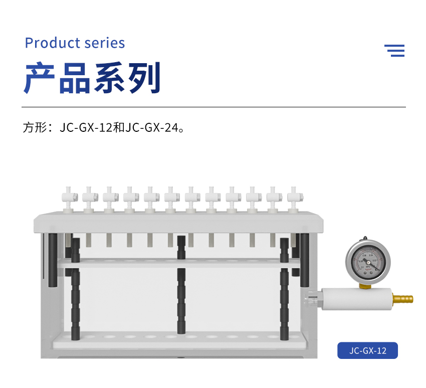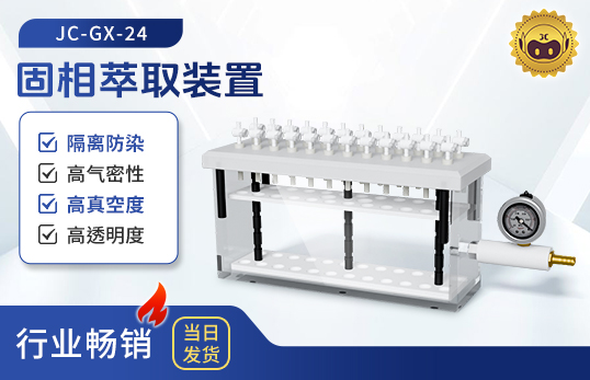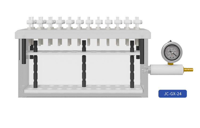 聚創JC-GX-24型固相萃取裝置是由液固萃取和液相色譜技術相結合發展而來,利用固體吸附劑將液體樣品中的目標化合物吸附,與樣品的基體和干擾化合物分離,然后再用洗脫液洗脫或加熱解吸附,達到分離和富集目標化合物的目的(即樣品的分離,凈化和富集),目的在于降低樣品基質干擾,提高檢測靈敏度,其應用于各類食品安全檢測、農產品殘留監控、醫藥衛生、環境保護、商品檢驗、自來水及化工生產實驗室。二、產品參數