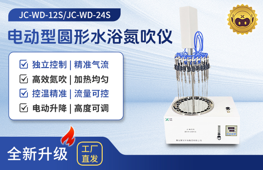 聚創(chuàng)JC-WD-12S/24S型電動型圓形水浴氮吹儀采用水浴恒溫加熱的方式,將氮氣快速、連續(xù)、可控地吹入加熱的樣品表面從而將樣品進行濃縮,這種方法省時、操作方便、容易控制。